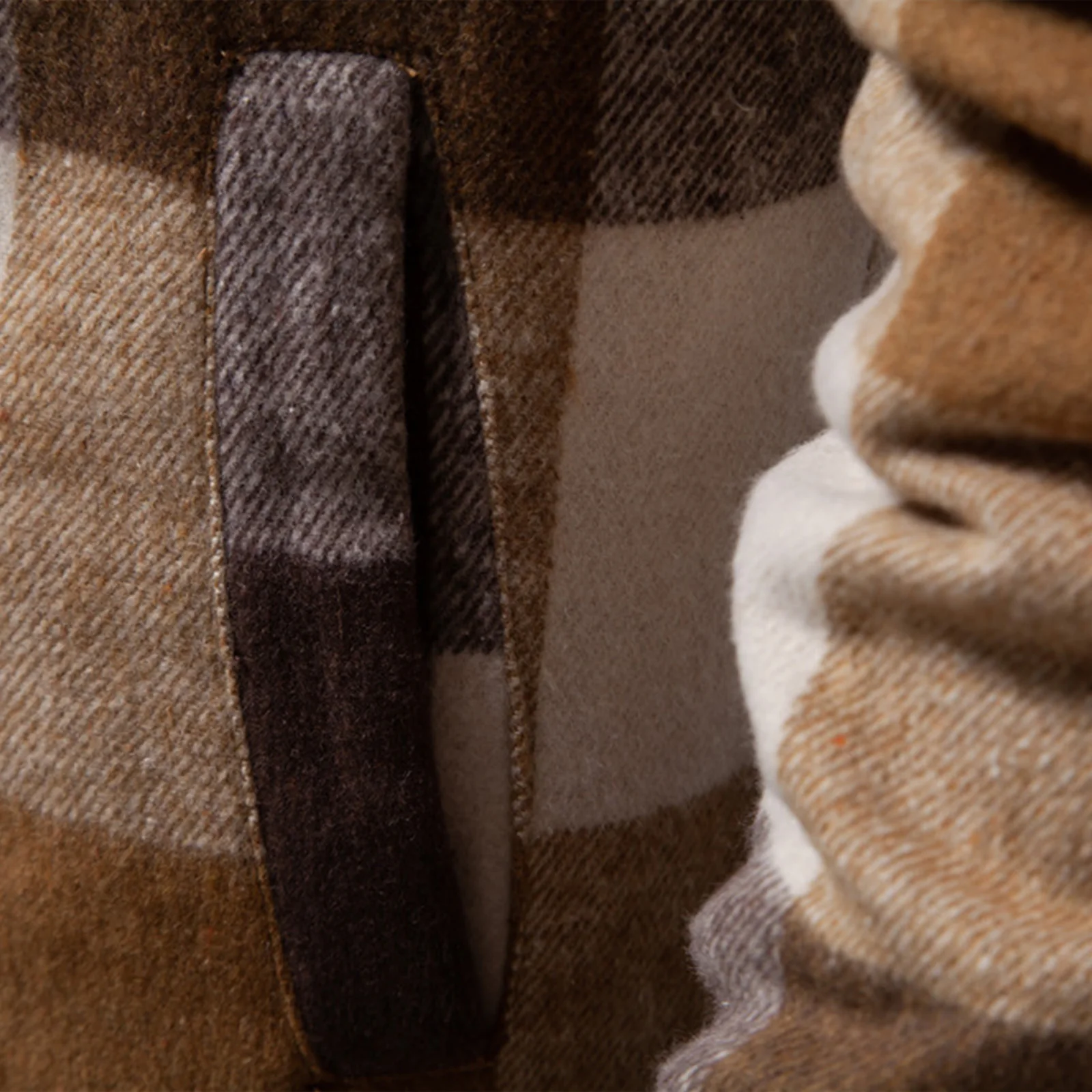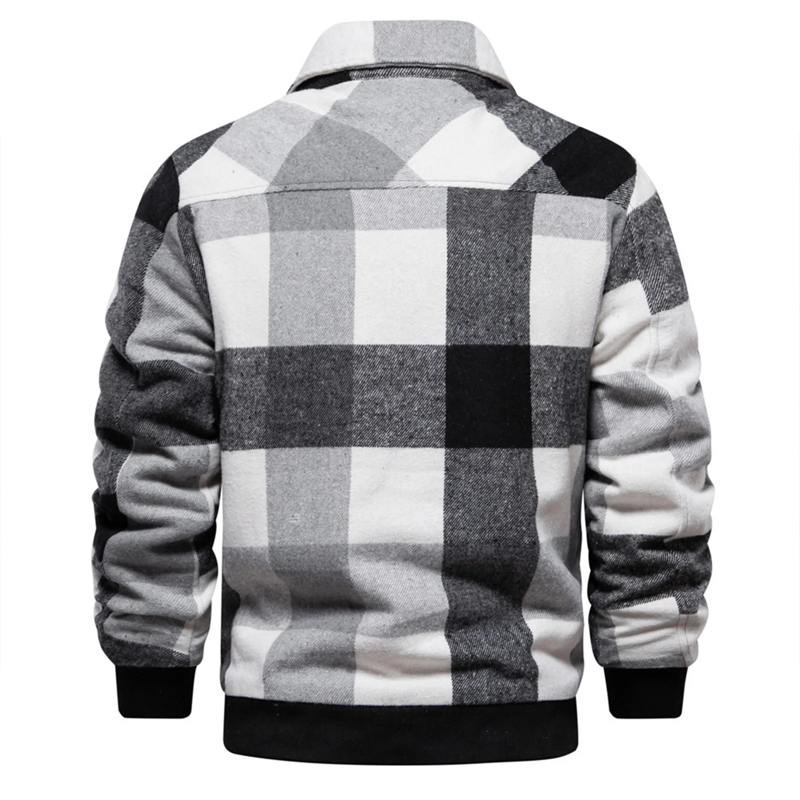 El diseño se caracteriza por su patrón de Tartán/Cuadros en el cuello de solapa, contrastando con un patrón a rayas en el cuerpo, ideal para un look diario desenfadado y a la moda.